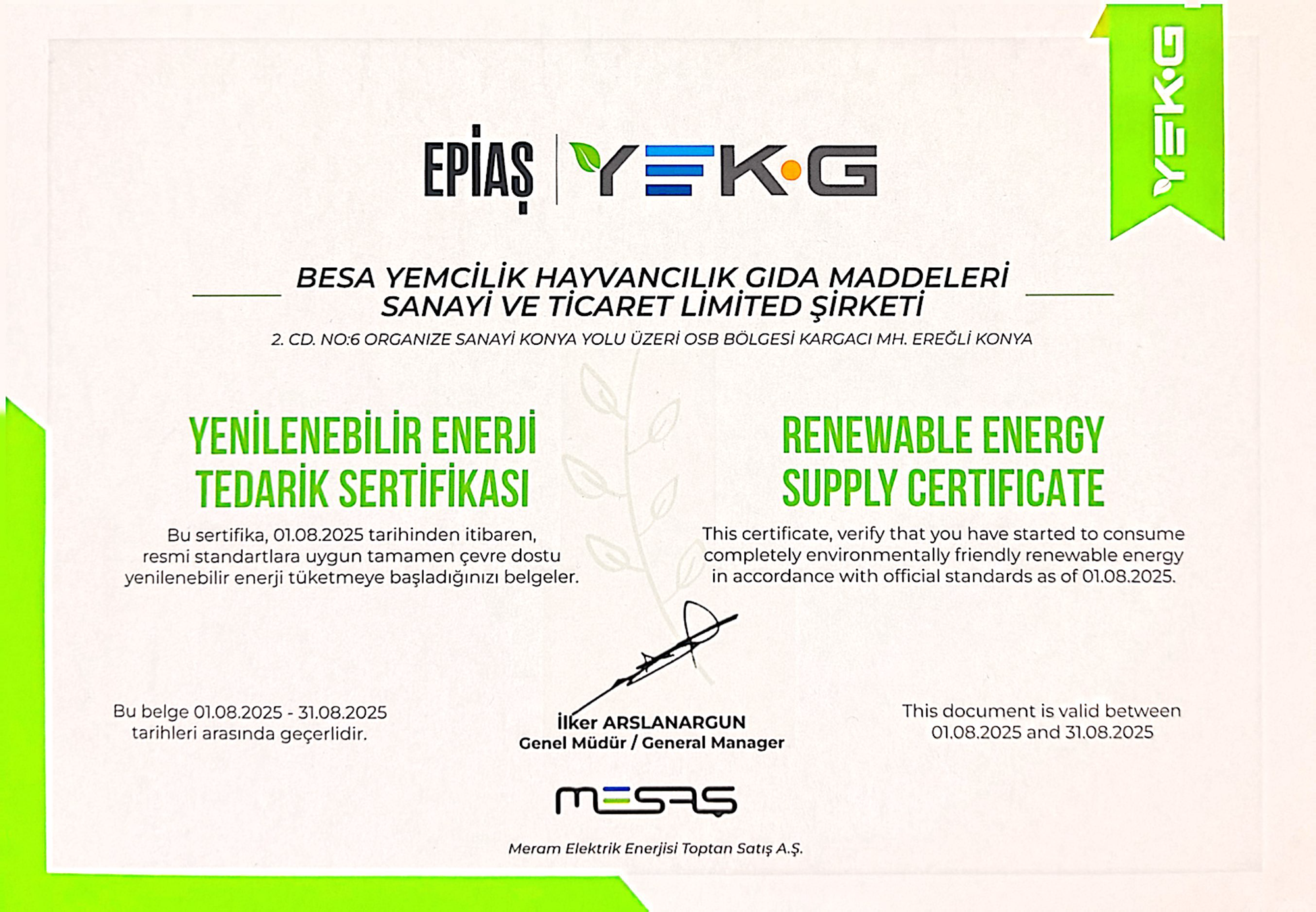 Konya Ereğli’deki tesislerimizde kullandığımız elektrik enerjisinin yenilenebilir kaynaklardan karşılamaya başladığımızı paylaşmaktan büyük bir gurur duyuyoruz. EPİAŞ tarafından onaylanan YEK-G (Yenilenebilir Enerji Kaynak Garanti Sistemi) sertifikamızla, karbon ayak izimizi minimize ederek üretimimizin her aşamasında doğa ile dost bir yol izliyoruz.